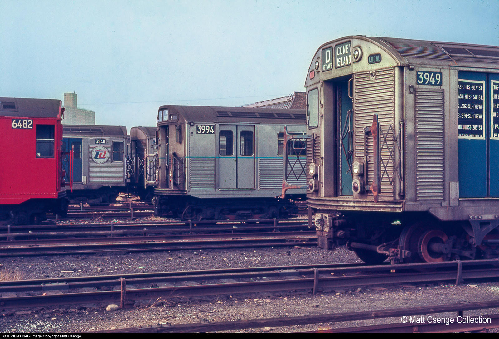 A variety of New York City Transit Authority (NYCTA) equipment is seen laid up at Coney Island Yard on October 13, 1968, including R16 no. 6482 (ACF, 1955), R32 no.s 3949 and 3540 (Budd, 1964), and R38 no. 3994 (St. Louis Car Co., 1966-1967).