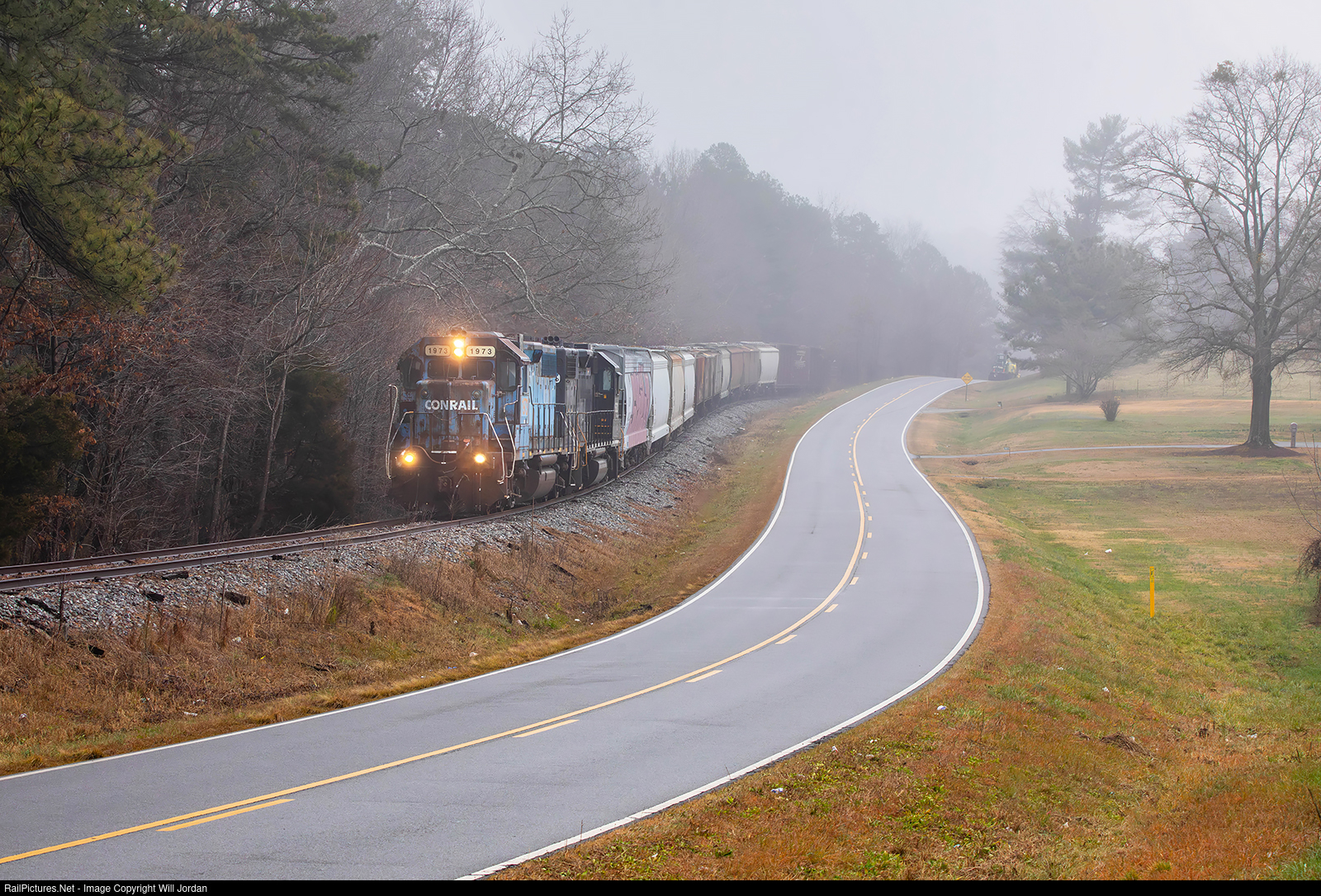 Former Penn Central/Conrail/CSX GP38 No. 1973 leads a northbound on the Hartwell Railroad, curving through the fog at Eastanollee.