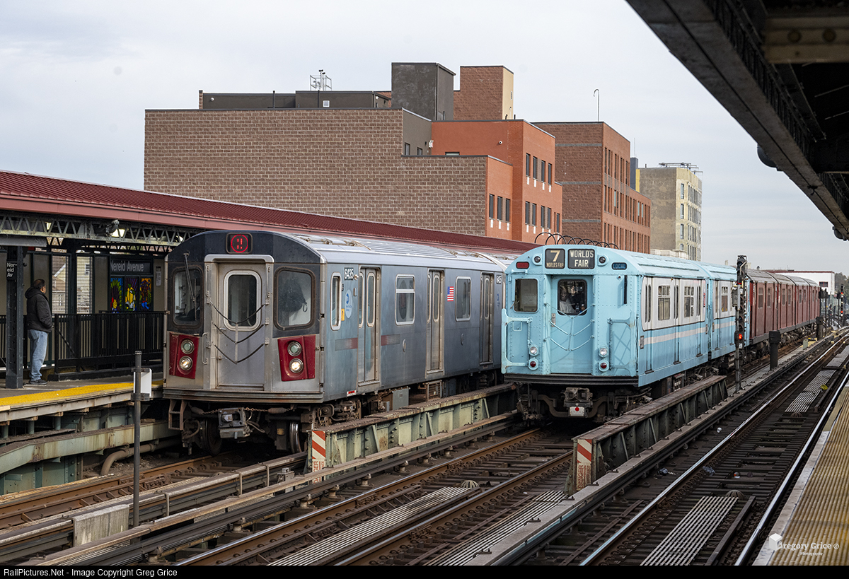 On the morning of November 4th, 2023, New York City Transit's St. Louis Car Company R33WF #9308, painted in World's Fair colors, trailed on a 6 car vintage train of Redbirds & Bluebirds as it passed a train of Bombardier R142's at Nereid Ave on IRT White Plains Road Line in the Bronx borough of NYC. The train took passengers on a nostalgia ride round trip between South Ferry Station in Manhattan and 239th Street Yard in the Bronx.