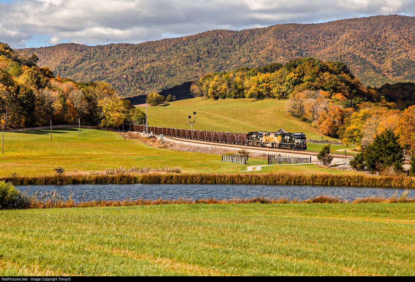 A Herzog ballast train heads up the Shenandoah Valley of VA behind a glossy new AC44C6M. The fall colors were beautiful in Southwest Virginia this year making for some excellent photo opportunities.