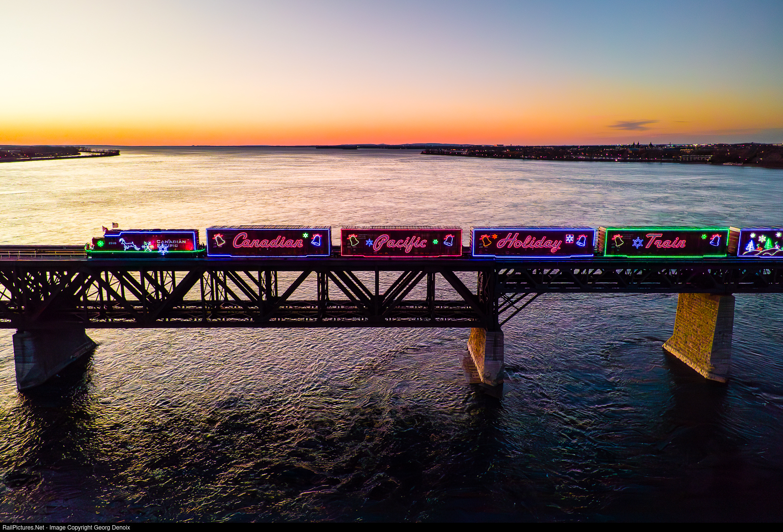 | On its way South, the CP Holiday Trais sets out to leave the island of Montreal on CP's Adirondack Sub, crossing the St. Lawrence River just after sunset on a beautiful late-November evening. |