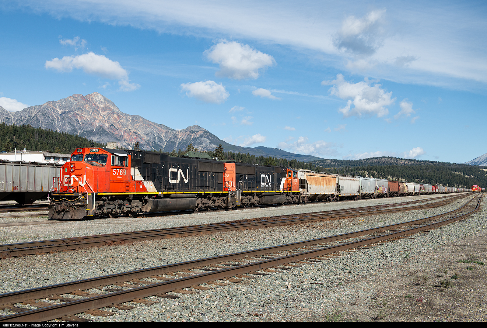 | Vermillion, AB - Vancouver, BC grain loads are tied down in track #5 at Jasper awaiting a crew and space at the port. |