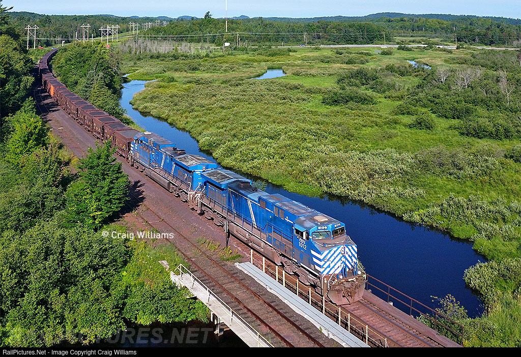 | A Tilden 7 is about back to Eagle Mills Yard with loads out the Tilden Plant. The train crosses the Carp River as they slow for the yard. These cars will head to Marquette this afternoon for unloading into a boat.