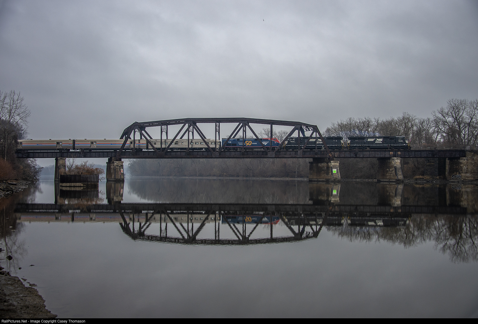 The 2023 Norfolk Southern + Amtrak "Capital Region" Toys For Tots train crosses the Mohawk River in Schenectady, NY, beginning its run down the former D&H mainline to Binghamton.