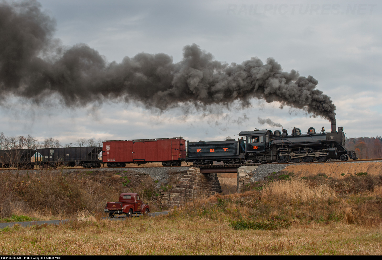 EBT 16 hauls a mixed train through the Auchwick Valley during a Dynamo Productions photo charter. A red Pennsylvania Railroad Ford truck travels along Runk Road. Taken with a Nikon D60.