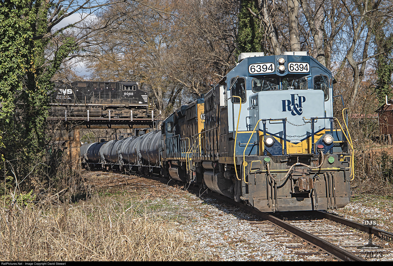 | CSX L810 is southbound on the Cartersville Subdivision at Rockmart, Georgia, as NS 936 passes overhead on the Atlanta North District in December 2023. CSXT GP40-2 6394 is now known for its distinguished 1980's RF&P front end. 6394 was built as RF&P 142 in September 1972. |