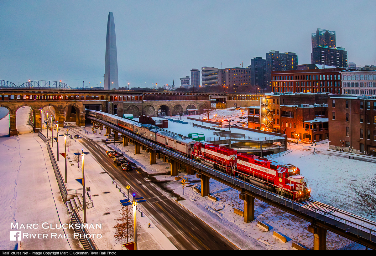 Red And White All Year 'Round For Christmas. On December 15, 2019, Terminal Railroad Association of St. Louis TRAA GP38-3 2010 (née-AGS 2812, GP38, EMD, 3/1970) and 2006 (née-DRGW 3083, GP40, EMD, 10/1969) led the Polar Express Train under the Eads Bridge as it approached the Martin Luther King Junior Bridge in downtown St. Louis, Missouri with the Eero Saarinen designed Gateway Arch in the background after the nominal sunset time on a snowy day. Ownership of the TRRA is divided amongst CSX, NS, UP, CN, and BNSF, and it serves as freight switching operation between all of these carriers and CPKC. The annual Polar Express trains are a rare opportunity for the public to ride these rails, with trains departing from St. Louis Union Station throughout the season.