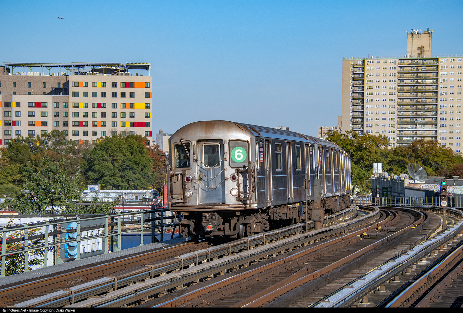 | Approaching the 6 Line’s Elder Avenue station in the Bronx is a southbound Pelham Bay Park Express, comprised of R62A cars (with NYCT 1676 leading). This train originated at Pelham Bay Park and is heading to Manhattan-Brooklyn Bridge–City Hall. (New York, New York – November 3, 2023) |