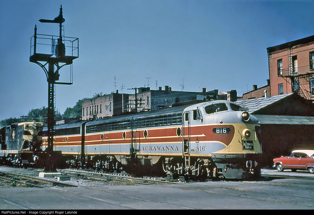 Lackawanna Railroad train 6 the PHOEBE SNOW with 816 in the lead, passing through Waverly on September 6, 1959. The DL&W trains were operating by trackage rights over the Erie Main through Waverly, N.Y. Erie semaphores handled automatic block signals on this two track main. Photo by Al Holtz, from my collection.