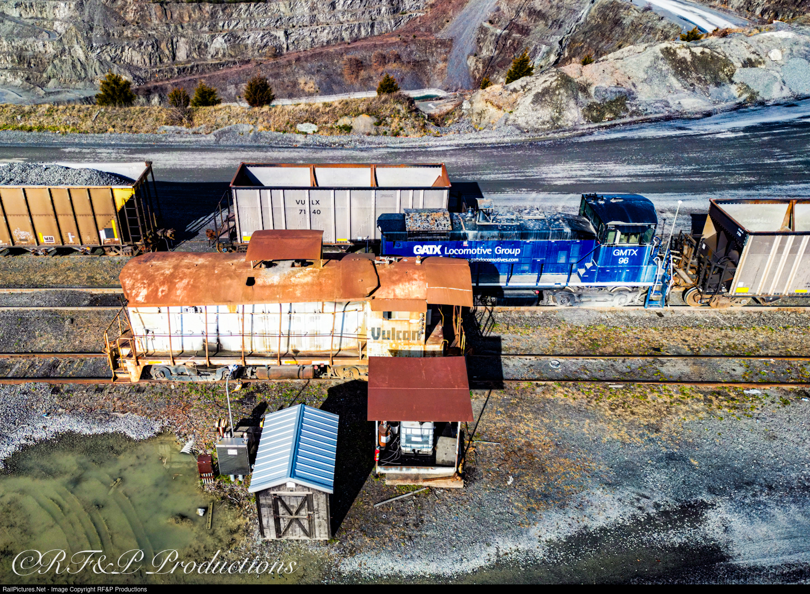 | Cradle-to-Cradle: After decades of service to the KCS Railway, this 75-year old EMD NW2 now wears the colors of the Vulcan Materials Company. Here it sits with GMTX 96 (Ex-BN and BNSF) as they await their next switching assignment in the Vulcan Materials plant of Manassas, VA. While it's nearly impossible to see these locomotives in person without special permission from employees on-site, the area can be accessed by drone with LAANC authorization. |