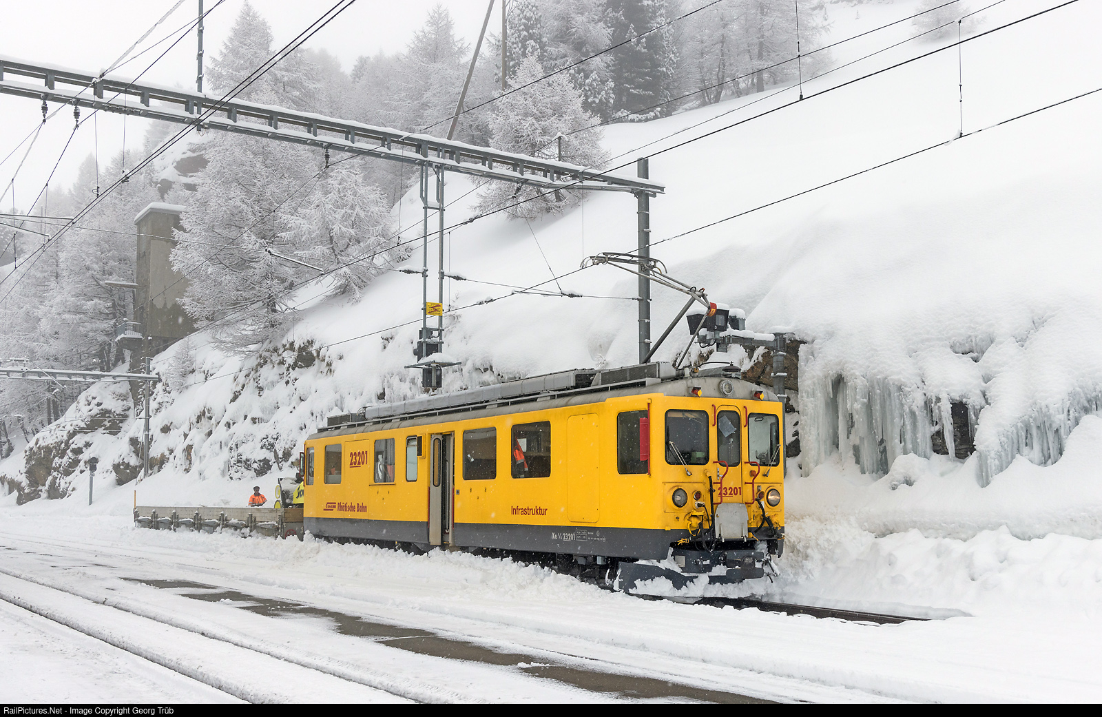 | Railcar Xe 4/4 # 23201 of the Rhaetian Railway infrastructure department is on Alp Grüm with the Xae-t # 93105 flat car and the crew for snow clearing. The railcar is former ABe 4/4 II # 48 built in 1972, rebuilt in 2012. |
