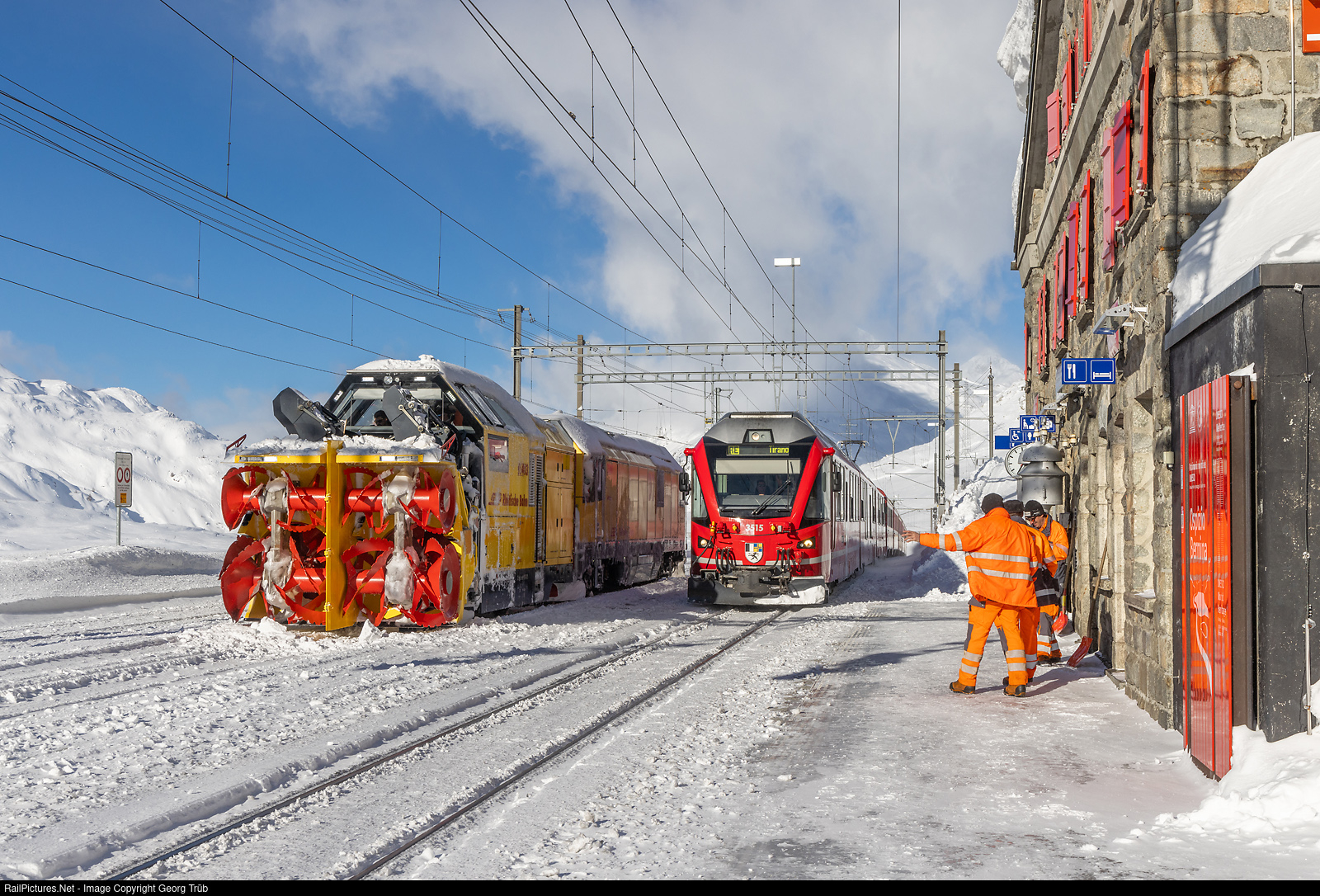 RailPictures.Net Photo: 3515, 95403, 23401 RhB - Rhätische Bahn ABe 8/12, Xrot mt, Gmf 234 at Ospizio Bernina, Switzerland by Georg Trüb