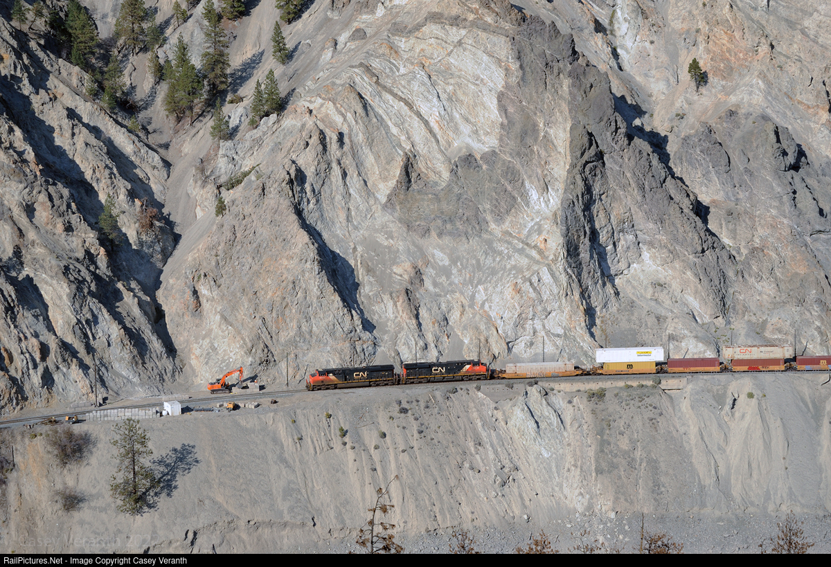 | Two things are synonymous with mountain railroading: mountains and maintenance of way. The Thompson River Canyon is a sight to behold as tracks cling to a two thousand foot (600 meter-ish, forgive me) rocky slope with enough rock sheds to lose count. Even better, it's possible to lose count of the number of trains winding their way through this major artery of North American railroading. |