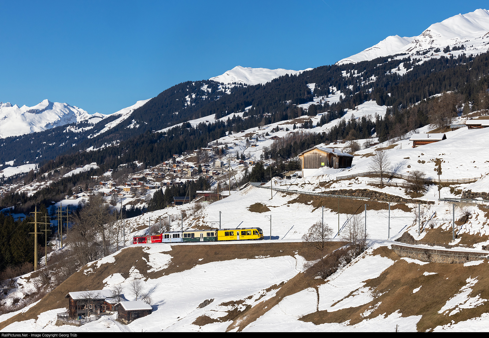A very colorful train of the Rhaetian Railway runs over the 6.0 grade through numerous curves of the Chur-Arosa line between Peist and Langwies. The new designed ancestor train (heritage livery "Ahnenzug") "Allegra" ABe 8/12 # 3514 is the very first day in service on this line, which was taken over by the Rhaetian Railway in 1942. First car is in the yellow colors of the former independent Bernina Railway, which was taken over by the RhB in 1943. Second car has the green/cream colors of the RhB at that time. And third car is in the lightblue/lightgrey of the former Chur-Arosa Bahn (ChA), which was inaugurated in 1914 with 2400 V DC and taken over by the RhB in 1942. This is train 1429 of the line R16 from Chur to Arosa. In the background the houses of the village Peist and from left to right: 2697 meter high Felsberger Calanda, 2266 meter high Montalin, 2420 meter high Schafläger and 2474 meter high Ratloser Stein.