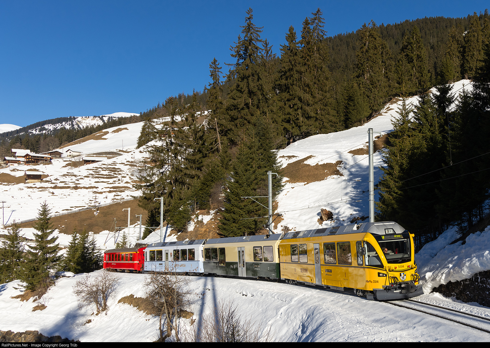 | A very colorful train of the Rhaetian Railway runs over the 6.0 grade through numerous curves of the Chur-Arosa line between Peist and Langwies. The new designed ancestor train (heritage livery "Ahnenzug") "Allegra" ABe 8/12 # 3514 is the very first day in service on this line, which was taken over by the Rhaetian Railway in 1942. First car is in the yellow colors of the former independent Bernina Railway, which was taken over by the RhB in 1943. Second car has the green/cream colors of the RhB at that time. And third car is in the lightblue/lightgrey of the former Chur-Arosa Bahn (ChA), which was inaugurated in 1914 with 2400 V DC and taken over by the RhB in 1942. This is the push-pull train 1429 of the line R16 from Chur to Arosa. |