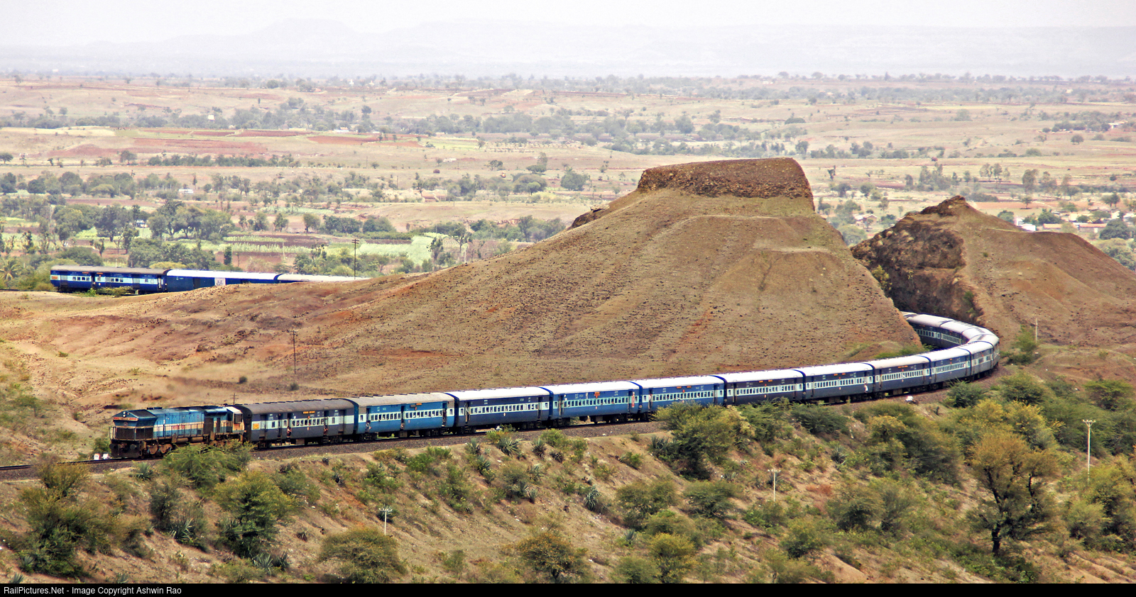 Kirshnarajapuram shed's WDP4 negotiating a horse shoe curve near Adarki with the 24 coacher rake of 12630 Hazrat Nizamuddin Samparkanti Express Via Pune.