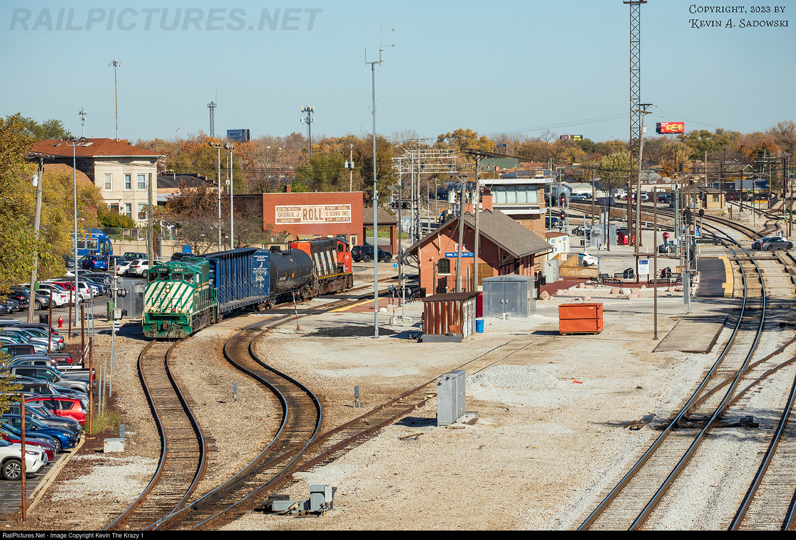 The Chicago Rail Link passes the Metra depot at Blue Island after servicing Great Northern Lumber up at 127th Street on the Beverly Branch.