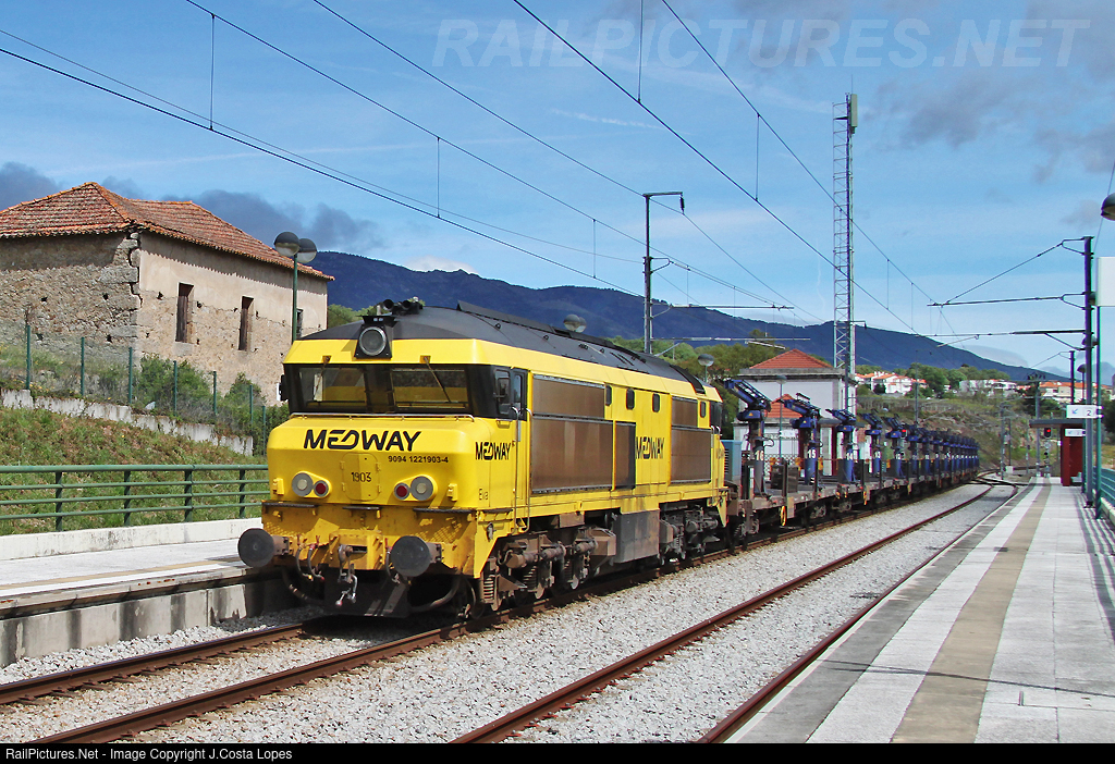 | An empty rail transport, pulled by diesel locomotive Alsthom 1903, from V.Formoso to Entroncamento.
