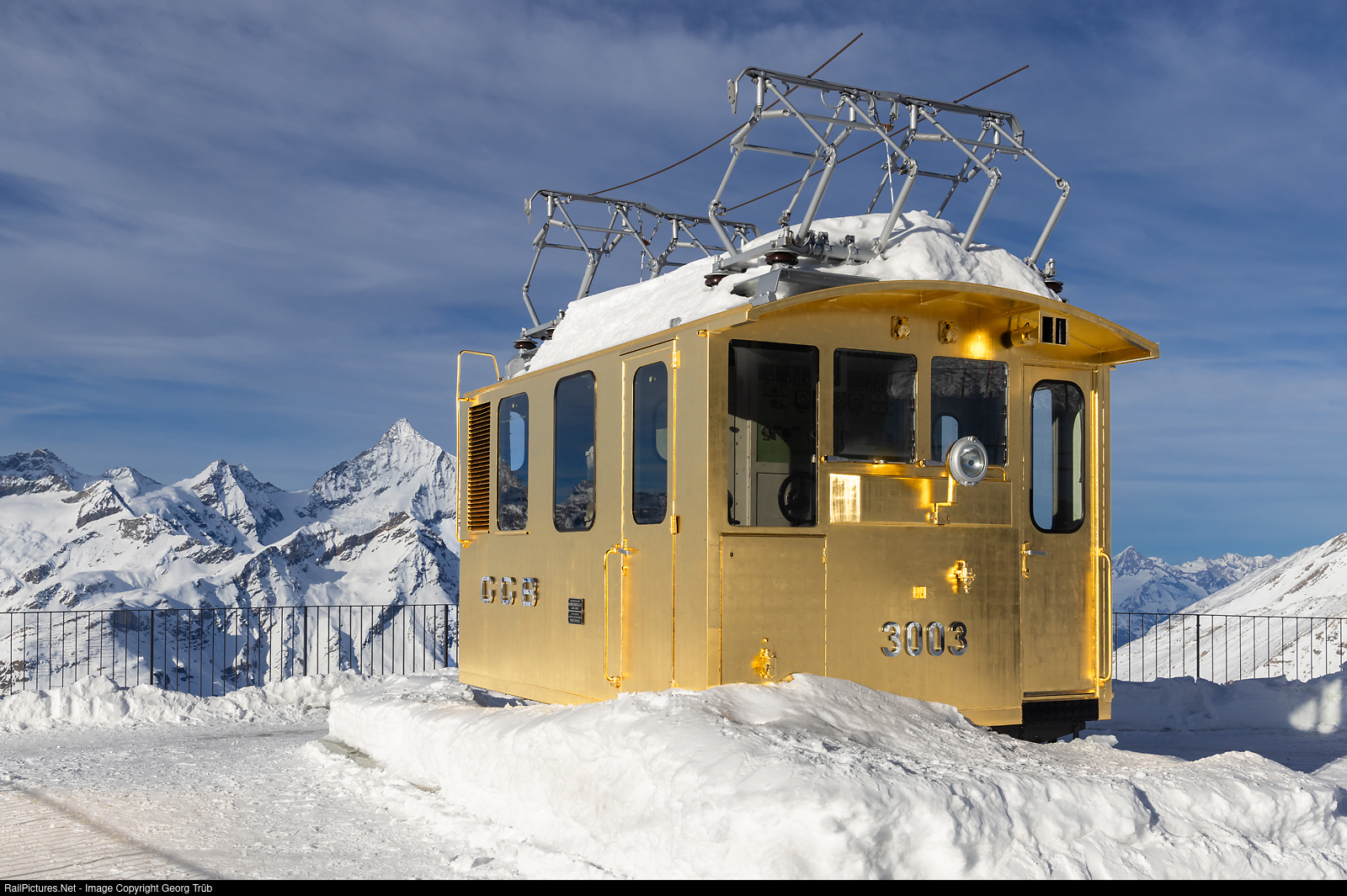 Since august 20, 2023, when the Gornergrat Railway ((GGB) celebrated 125 years of operation (1898 to 2023), on the Gornergrat the electric locomotive He 2/2 # 3003, built in 1898 by SLM and BBC, is exhibited as "Golden Spot", Gold-plated with gold leaf. The 132 kW locomotive was officially decomissioned on april, 23, 2023 only, although it has not been used for decades anymore. After august, 20, access to the locomotive was still closed for many weeks, first a wheelchair-accessible path had to be created and various information boards were erected. Now the "Golden Spot" (official designation) is open for the public and will be a "must" to photograph in front of the impressive panorama for the visitors, here with the 4505 meter high Weisshorn. Two people were employed for 1 month to make the golden locomotive, applying over 14000 pieces of 8x8 cm 23 3/4 carat Rosenobel red gold leaves.