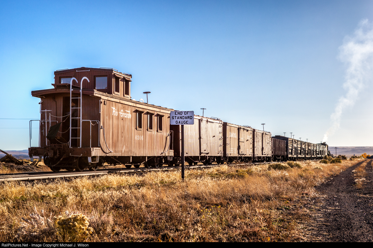 | "End of Standard Gauge" - a phrase that marks this section of the former D&RGW narrow gauge mainline near Antonito, CO. From here towards Chama and beyond it is all 3 foot track as K-27 #463 awaits to head west with her empty stock car train on October 19, 2023. |