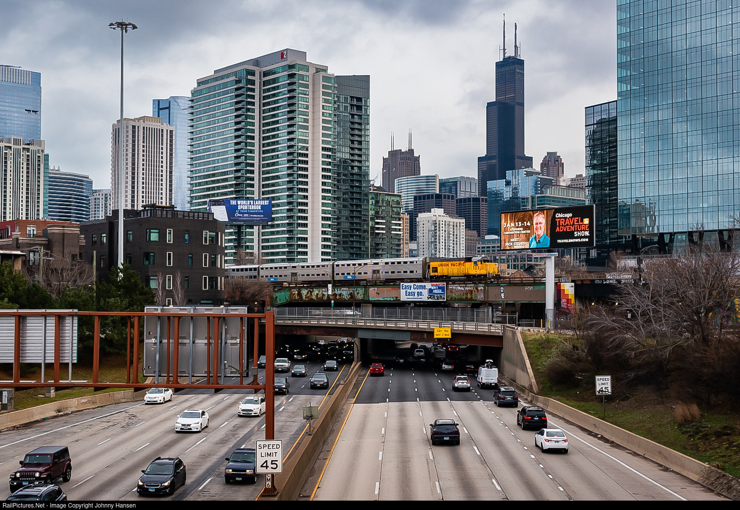 | The Northside Commute. During pre-rush hour in Downtown Chicago, a Metra equipment set coming from California Ave Coach Yard can be seen on it’s way to Ogilvie Transportation Center in preparation for the evening rush hour. UPY 723, a yard switcher from California Ave shoves the empty coaches over the Kennedy Expressway. With Metra slated to take over this territory very soon, it may not be long before Metra painted Geeps take over these scenes. |