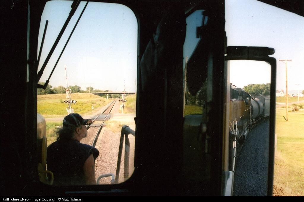 Conductor of the Blair Turn enjoys the weather on the deck of the 3519 as he waits for four westbounds on the Transcon and a green signal to head home.