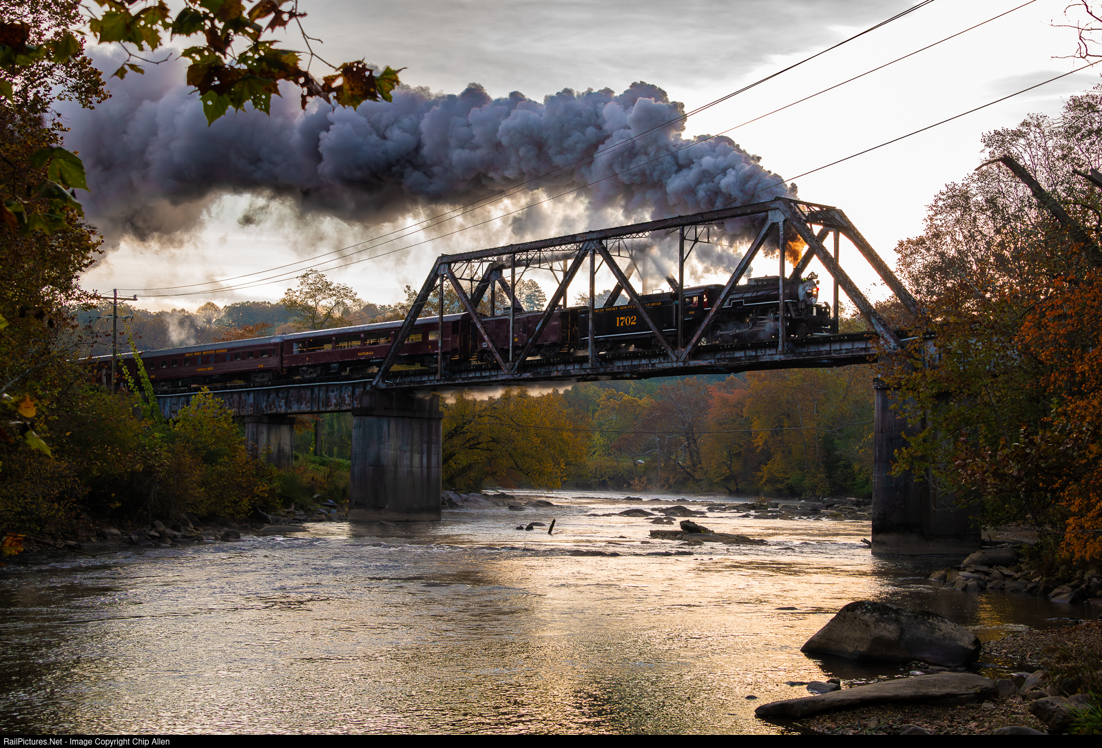 | At daybreak, Great Smoky Mountains Railroad 1702, stunningly looking more like Southern Railway 2716 (and hopefully retaining this look for several years), barks over the Tuckasegee River with a long train of tourists bound for the Nantahala Gorge in tow. |