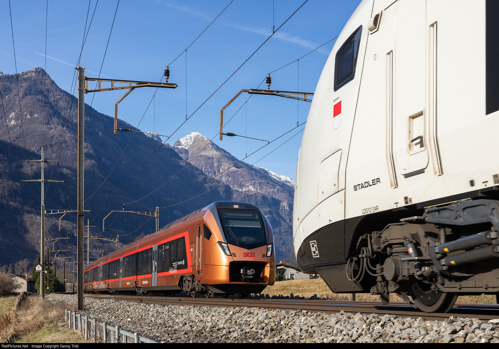 Random meeting of two trains both running at about 130 km/h between Castione-Arbedo and Claro. On the right "Giruno" RABe 501 # 012 "Solothurn" of the SBB running as Eurocity 150 from Milano over the Gotthard mountain line to Zürich. On the left "Traverso" RABe 526 # 214/114 of the Südostbahn, running the IR 2417 of the line IR 46 TRENO GOTTARDO from Zürich over the Gotthard mountain line to Locarno.