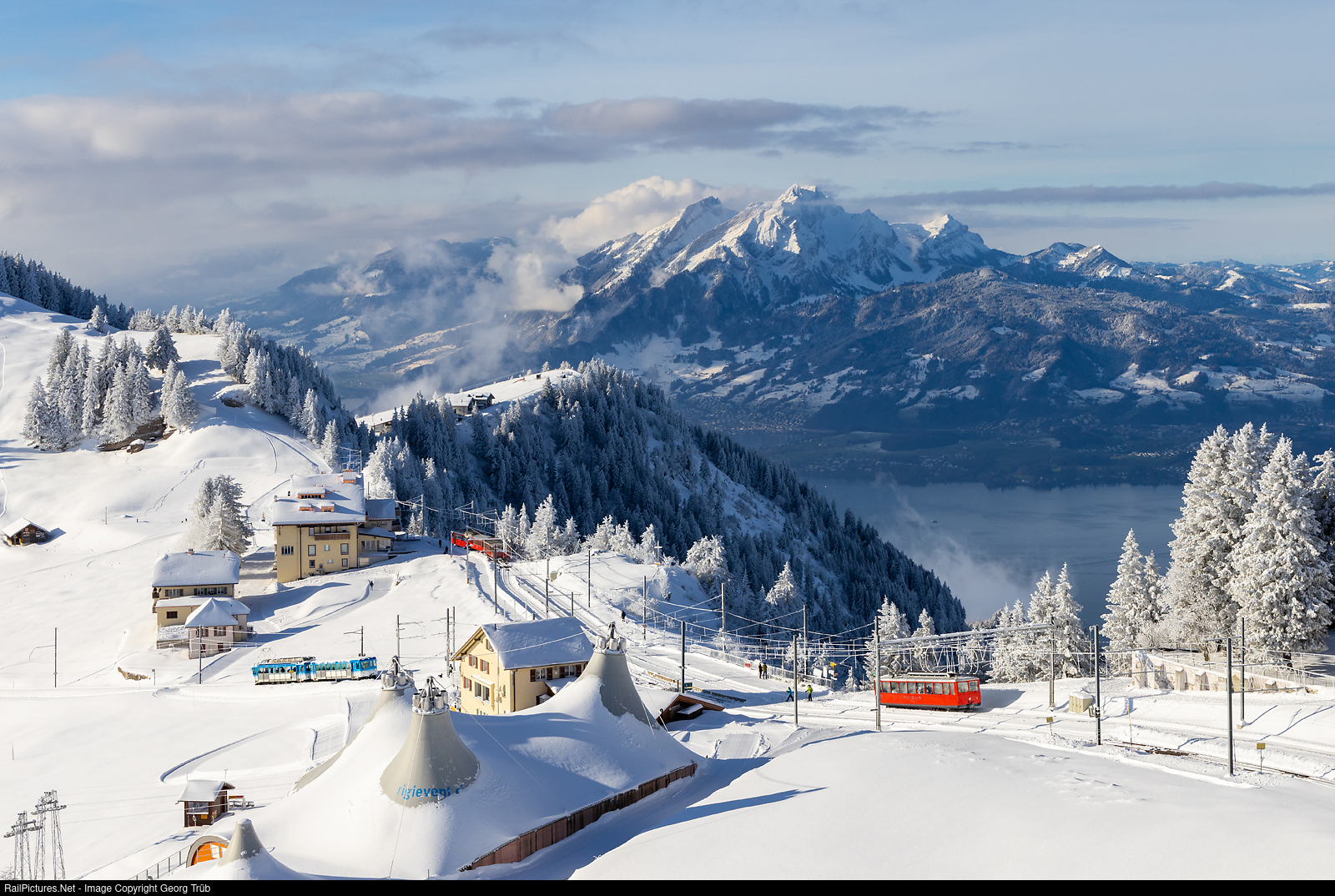 Winter morning on the Rigi mountain, with view to Rigi Staffel station and the Pilatus. The red railcar Bhe 2/4 # 1 from 1937 just left Rigi Staffel for Rigi Kulm, running as relief train. In the background is the BDhe 4/4 # 5 with cars B # 8, B # 15 and B # 5 as train 1115 from Vitznau to Rigi Kulm. From Arth Goldau is nearing the station Staffel the push-pull train with BDhe 2/4 # 12 and cab car Bt # 22.
