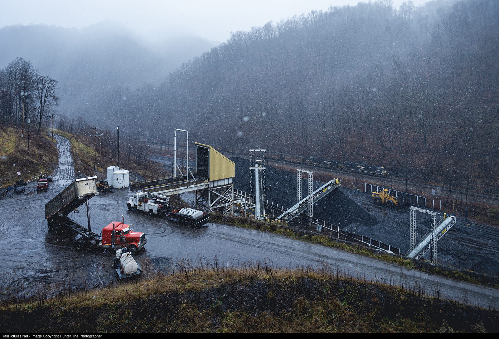 West Virginian Ways | Loaded coal train 766 crawls up the mainline on the famous Elkhorn Grade of the Norfolk Southern Pocahontas District, passing a coal transload facility near the community of Ennis, WV on a cold and snowy Monday, December 18, 2023.