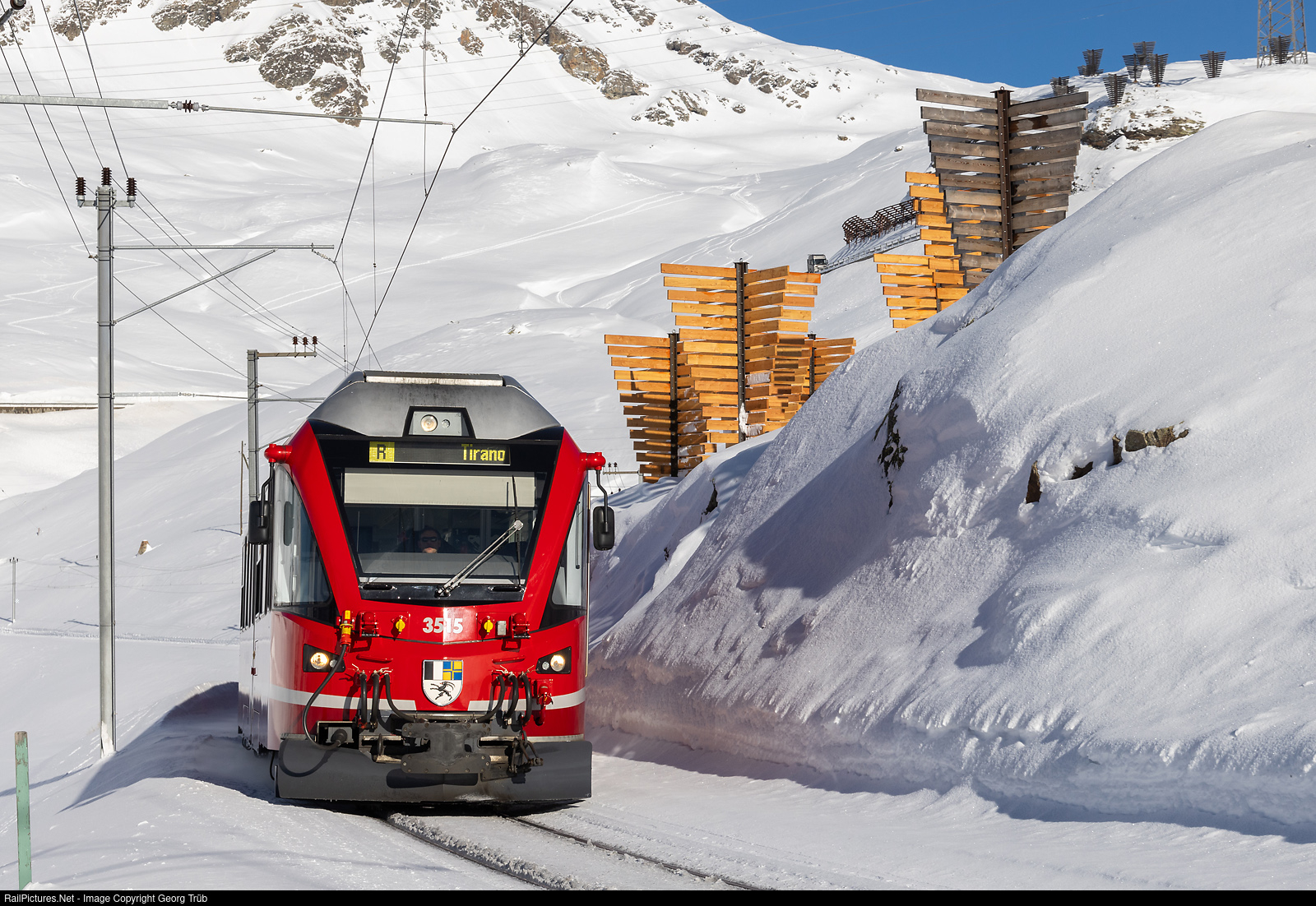 | "Allegra" ABe 8/12 # 3515 of the Rhaetian Railway with train 4629 of the line R19 from St.Moritz to Tirano is rounding the curve north of Ospizio Bernina. In the past, very large snowdrifts have formed here when there is a lot of snow. Now several so-called cross scouring boards (Kreuzkolktafeln in german) have been erected above the route. In contrast to drift fences, cross scour boards do not hold back the snow, but ensure better snow distribution and thus prevent the formation of large snow accumulations and cornices that extend to the tracks. The effect is quite convincing. |