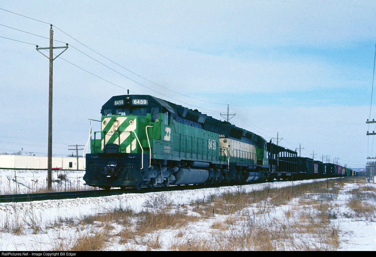 BN 6459 & 6465 lead a freight toward St. Paul at Newport, MN traveling on paired track shared with Milwaukee Road. Trailing unit, BN 6465 is still in its as delivered CB&Q scheme featuring the white "hockey stick" which would be dropped on BN freight power.