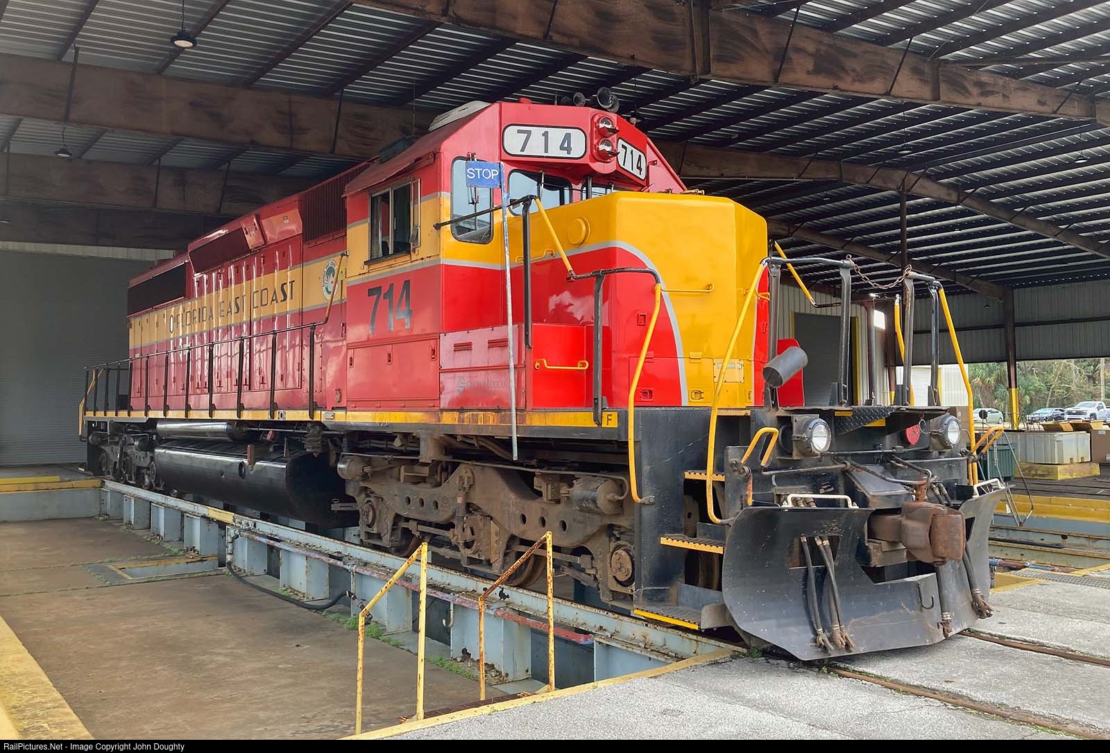 Florida East Coast 714, the first engine to receive the current Champions paint scheme back in 2012, sits at the New Smyrna Beach diesel repair shops. Inside the building, a gathering of employees and guests celebrate the unveiling of the FEC 820 and FEC 816 in the new Ferromex inspired paint scheme, as well as the unveiling of FEC 430 in the new Honoring our Veterans paint scheme. How long the Classic Champion paint scheme will last on the FEC only time will tell. Photo taken with permission.