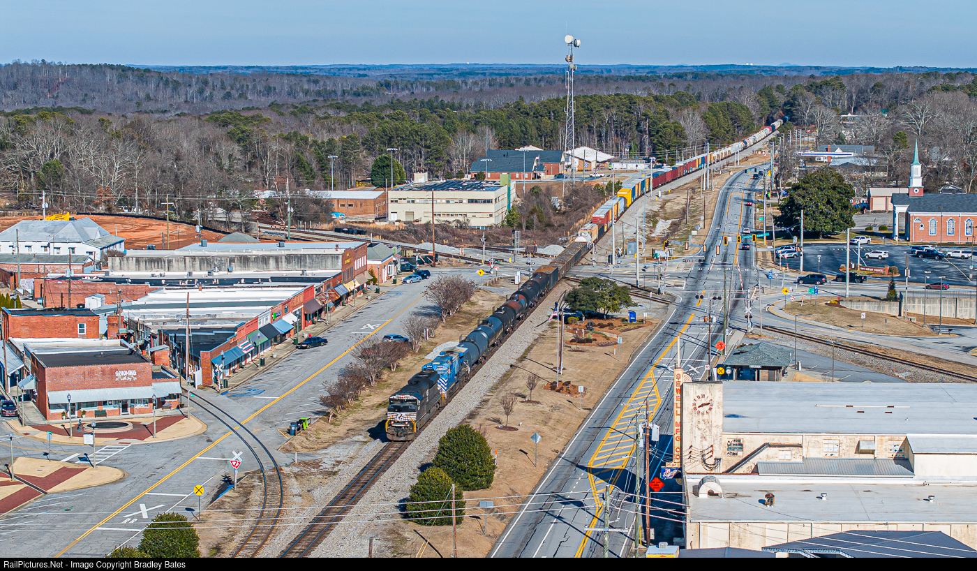 Norfolk Southern Freight Train 187 heads westbound through downtown Bremen, GA. on their way to Norris Yard in Irondale, AL.