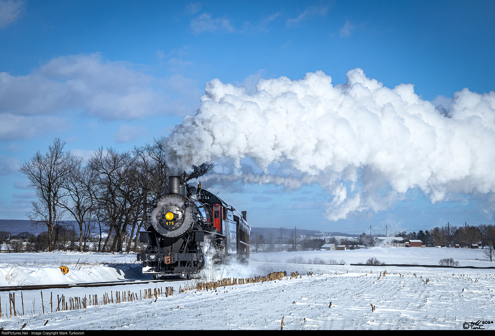Norfolk & Western 475 charges through the snow-covered Pennsylvania countryside at Beiler's on a cold January afternoon.