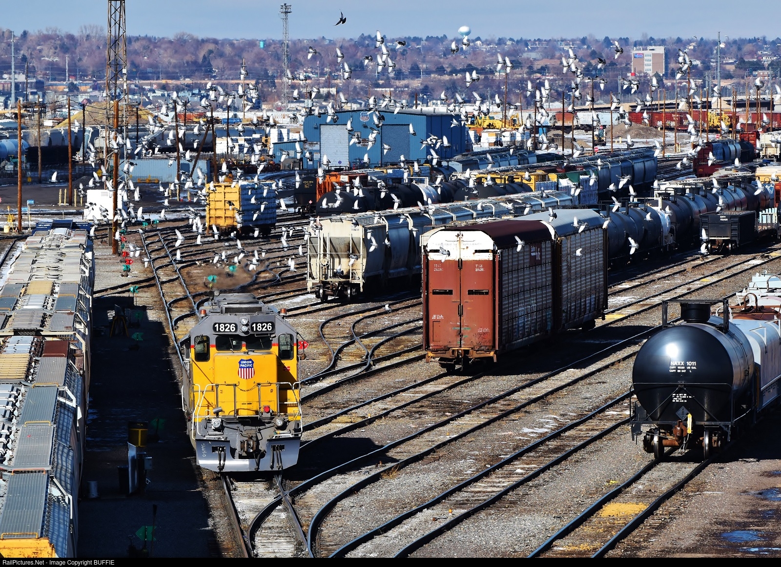 | I think Alfred Hitchcock would have liked this photo. UP 1826 (SD40N) works the Union Pacific's North Yard in Denver, Colorado as hundreds of birds circle, waiting for the chance to land on the tracks and feed on the spilled grain for loaded hoppers.