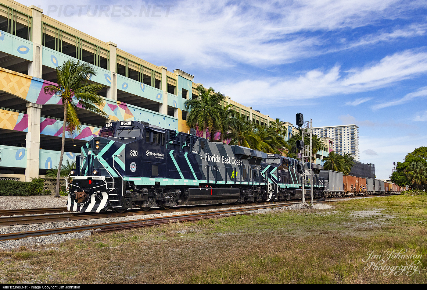 The Grupo Duo sporting the recently painted FEC engines 820 and 816 head south past West Palm Beach towards Miami. The scheme blends in well with the lively building colors on a beautiful morning.