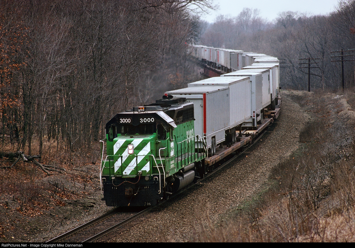 I know, the weather is crappy and it’s “stick” season in the Midwest—so why am I out photographing trains? Hey, when you’re working full time, you can’t always wait until the weather is nice on weekends. Besides, powering the long piggyback train is venerable BN EMD GP40 No. 3000, still working hard, complete with a nice dent in the nose. Originally built for CB&Q in December 1966 as their No. 170, the locomotive will be taken out of service shortly after this photo and remanufactured into a GP40M by June 21, 1989.