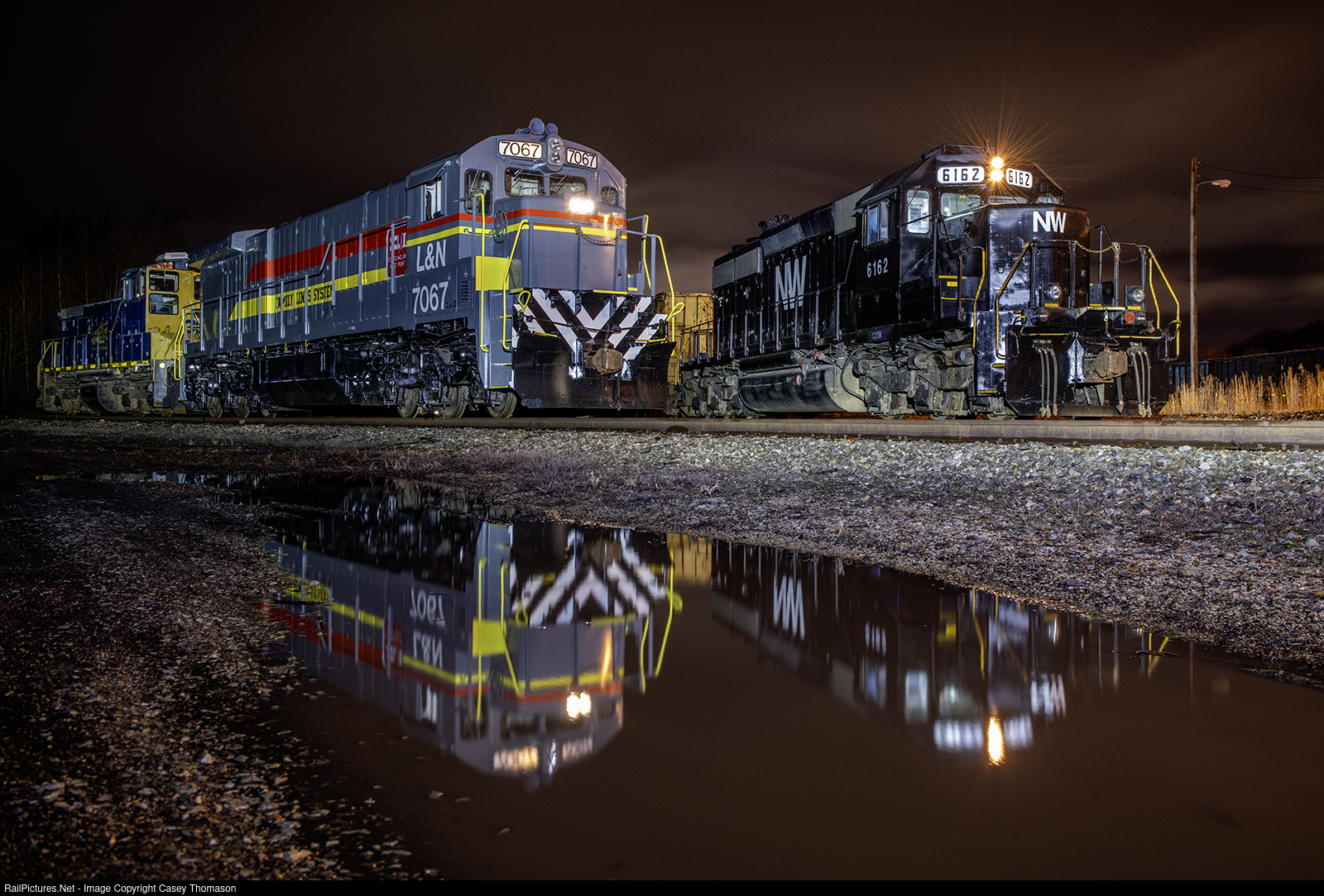 | One of the many scenes set up during the "Party Like It's 1979 Diesel Photo Event" at the Kentucky Steam Heritage Corporation's facility in Ravenna, KY, featuring Family Lines System C30-7 #7067 and Norfolk & Western SD40-2 #6162. |