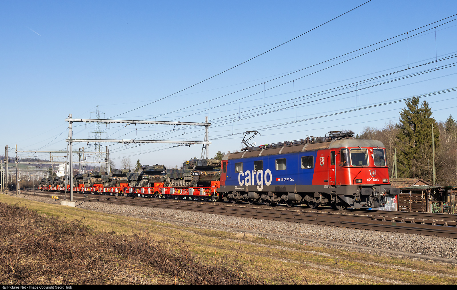 | Neutral Switzerland has an arms export law that prohibits deliveries to belligerent countries. This means that the export of unneeded battle tanks to Ukraine is also prohibited. After lengthy discussions in parliament, it was decided that a total of 25 "Leopard 2 A4" main battle tanks (Pz87 in the Swiss army) no longer required by the Swiss army could be sold to the supplier Rheinmetall Landsysteme Gmbh in Germany. Their use is only permitted in Germany or other NATO/EU countries. The transportation was carried out with 2 trains of 9 tanks each, loaded onto six-axle flat wagons Sagmms 490 of DB Cargo, new delivered by Tatravagonka in Slovakia. 7 tanks that are no longer able to drive themselves are to be delivered to Germany by road transport. SBB Cargo's Re 620 # 039 "Murten" (Re 6/6 # 11639) pulls the 820-ton train 69023 from Wil freight yard via Winterthur-Regensdorf to the Limmattal marshalling yard (RBLU) between Winterthur and Kemptthal, and onwards with the load of the previous day to Basel shunting yard for export to Germany. Train 69023 was delayed about 3 hours because of a line closure between Elgg and Winterthur Grüze due to a personal accident. |