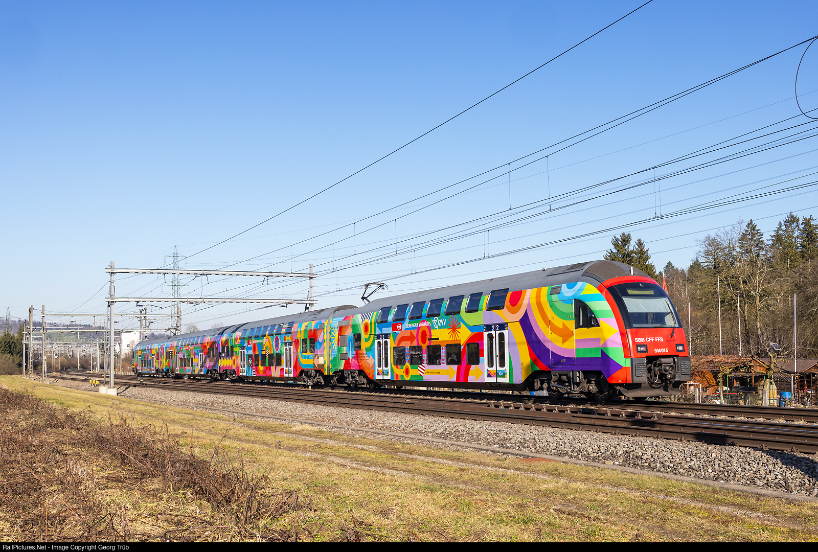 Doubledeck commuter train "DTZ" RABe 514 # 015 of the SBB, in the very colorful paint scheme "Gemeinsam vorwärts" (together ahead) of the ZVV (Zürcher Verkehrsverbund), running as S8 service 18853 from Winterthur via Wallisellen-Zürich-Thalwil-Wädenswil to Pfäffikon SZ, between Winterthur and Kemptthal.