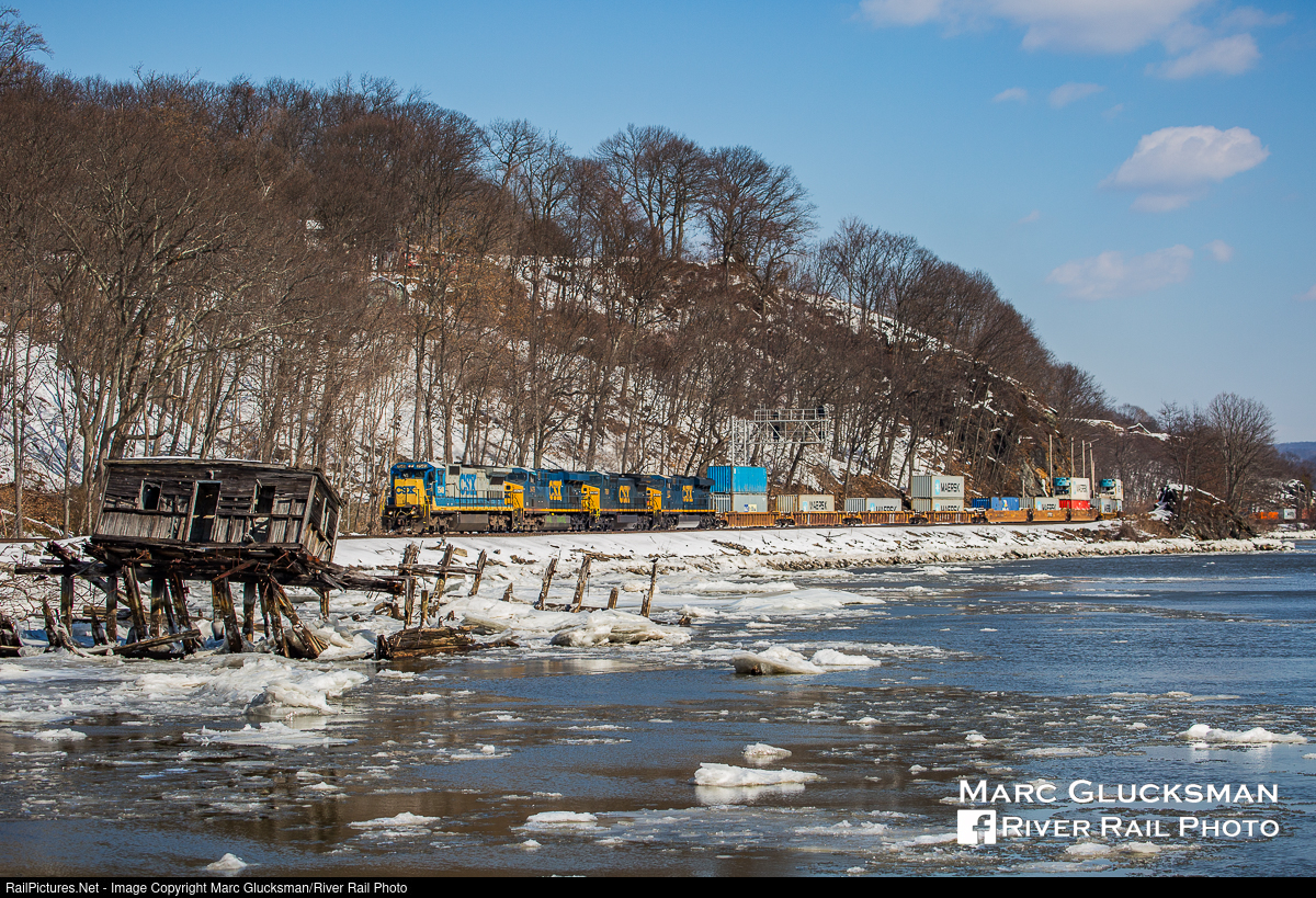 There Was A Barge There. On February 25, 2015 CSXT 7549 (C40-8, 9/1989) leads CSX train Q156 through Fort Montgomery, New York on the shores of an icy Hudson River. In the mid-ground of the photo are the remnants of a barge that ran aground at this location many years prior. Intermittently viewed as a photo prop and an obstruction, that winter the river washed its remaining upper structure. Low tide in this picture shows the remainders of the hull of the boat, which are still there today.