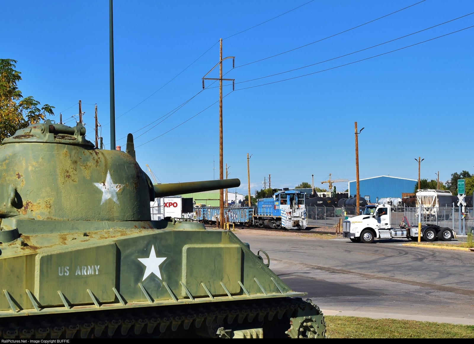 Denver Rock Island Railroad's SW1500 shoves a load of cars into the yard which is across the street from a Colorado National Guard armory.