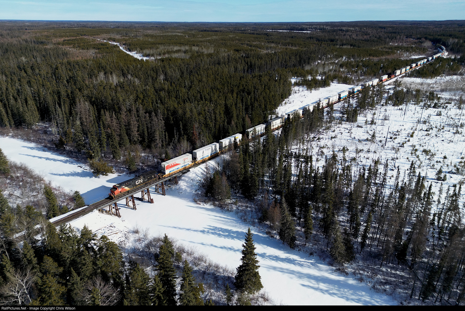 | CN ET44AC 3067 shoves the tail end of the Vancouver Intermodal Terminal, BC - Brampton Intermodal, ON hotshot stack train across the Foch River deep in Northwestern Ontario's Pic Forest. |