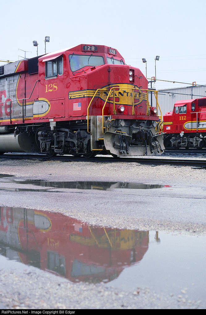 ATSF 128 and 112, both GP60Ms, face off at Corwith Yard, Chicago between runs to the West Coast.