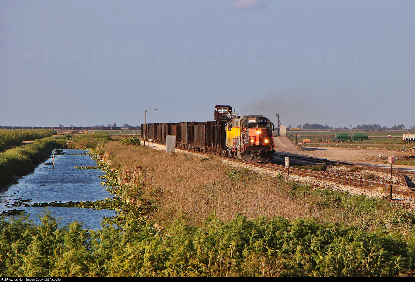 With a one of a kind railroad, comes one of a kind views. Seen here is Sugar Road Job 1 passing the Vaughn 1 loadout on the USSC Clewiston Mainline, featuring HLCX 6341 leading. Additionally, mixed in with the mirage in the background and roughly 2.5 miles away, Cane 1 with USSC 310 can be seen working the Mott 1 loadout on the SCFE mainline. Although both railroads use the same pool of engines, the private industrial USSC mainline is very much different from the common carrier side of South Central Florida Express.