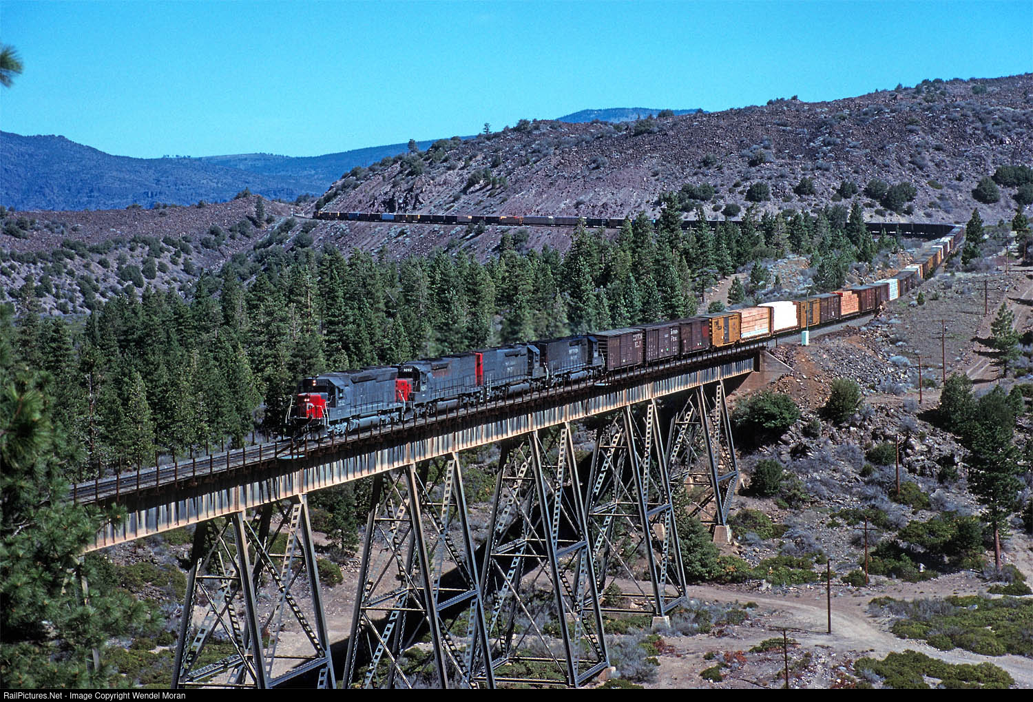 In 1987-1988, Southern Pacific closed the Modoc Line to through traffic. If the Modoc had been open, this EURGM would have been closing in on Alturas. Instead, the train is crossing Dry Canyon Viaduct on the Shasta Route.