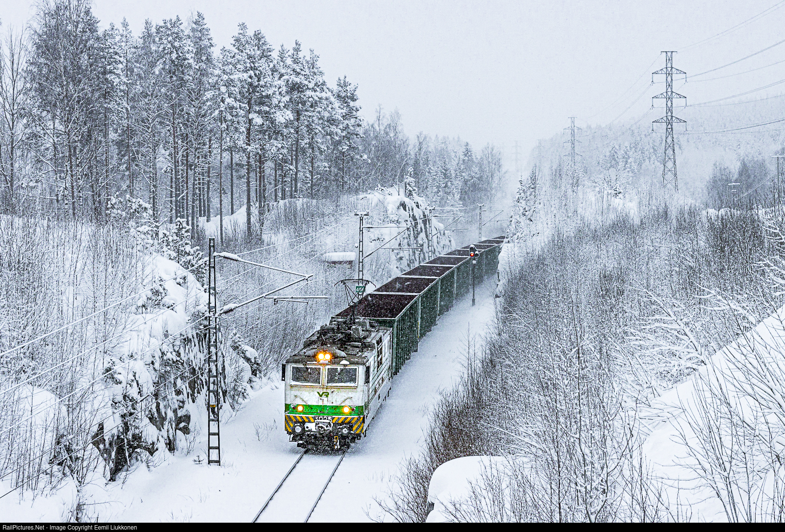 | Empty freight train comes behind the frozen bend as the class Sr1 pulls empty Russian wagons to Kajaani, which shall be loaded with wooden chips. |
