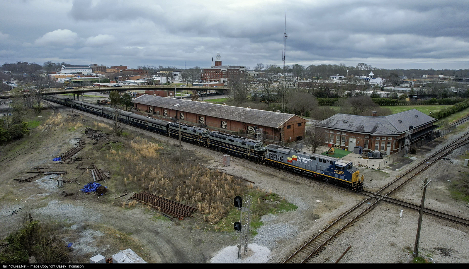 While operating on former Western Railway of Alabama (later Seaboard System) trackage in front of the old Opelika union station, the CSX office car special is about to cross the former Central of Georgia (now Norfolk Southern) mainline in Opelika, Alabama, during its circuitous inspection run from Greenwood, SC to Dothan, AL.