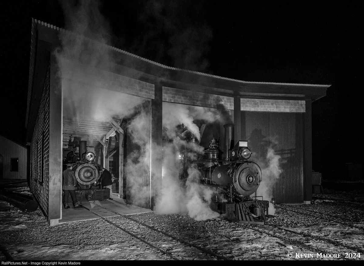 This scene was created during a February, 2024 photo shoot at the WW&F Museum in Alna, Maine, which featured the museum's newly-constructed Morse Engine House. This facility, which is named for long-time museum volunteer Frederick Morse, is the most complex structure on the property to date and is a pretty faithful replica of the 3-stall roundhouse which used to exist in the Wiscasset Yard on the original railroad. The current structure is located just under 5 miles north of Wiscasset, in the town of Alna, at the site of the Sheepscot Station on the original line. Now weather-tight, museum crews are in the process of finishing the interior, which will include a heating system, smoke-jacks and all of the facilities needed to support the museum's ultimate goal of 3 operational steam engines. Pictured here emerging from Stall #2 is WW&F Locomotive #9, an 1891 Portland Company product, which ran briefly on the original railroad near the end of operations. The Number 9 is the primary steam power at the WW&F Museum. On the left, in Stall #1, is Monson Railroad Locomotive #4, which is owned by the Maine Narrow Gauge Railroad Company & Museum. Although currently inoperable, the owners have plans to build a new boiler for her in the future.